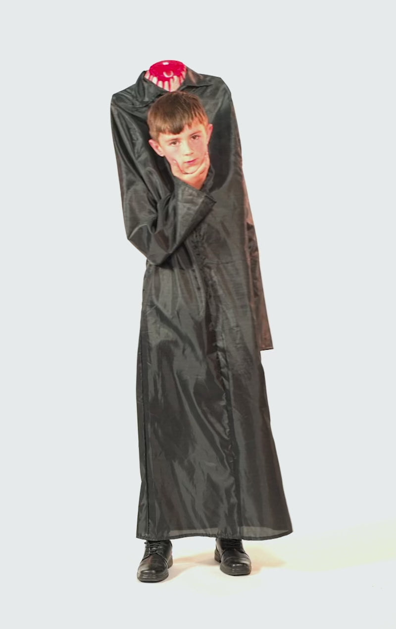 This strange and mysterious costume is sure to be a talking point, with its long black robe and attached shoulder piece, dispalying gruesome blood stains and making it look like their head has been chopped clean off! The costume sits taller than their own head and includes a face hole for their face to peep through, giving the appearance that they are holding their own head! The pictured dagger is not included, but why not check out our full range of fake weapons to add a personal touch.